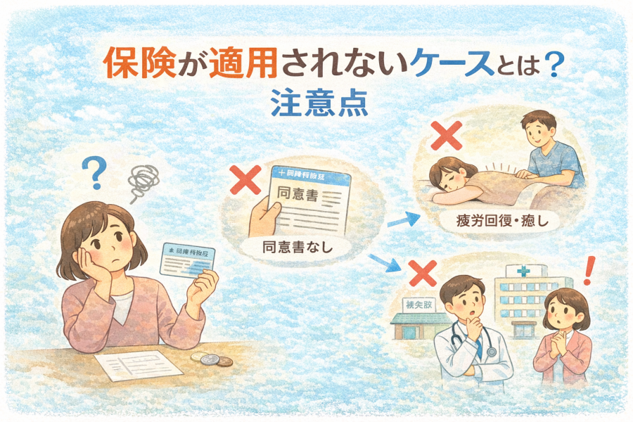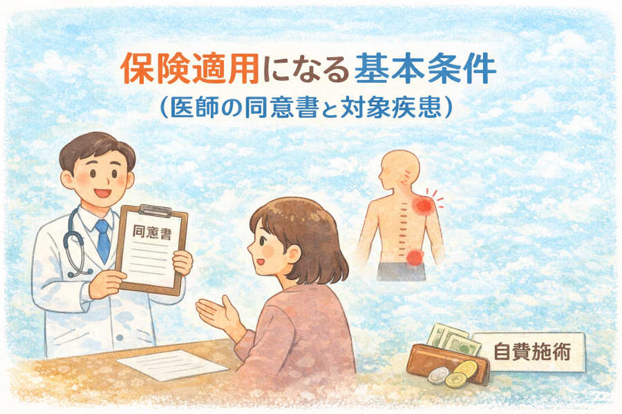 この点もよく聞かれます。鍼灸の保険適用では、医師の同意書が前提条件になっていると言われています。そのため、同意書がないまま施術を受けた場合、症状が対象疾患に近くても、保険は使えない扱いになることがあるようです。