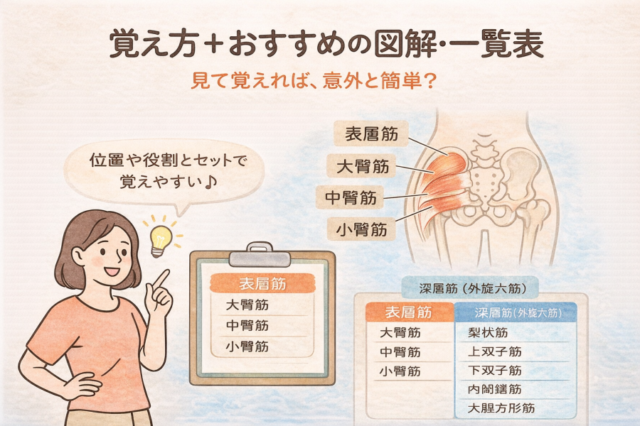 図解で位置・深さ・名前を同時に確認すると、記憶に残りやすいと言われています。さらに、一覧表で「表層筋」「深層筋」と分けて見ると、頭の整理がしやすくなるそうです。