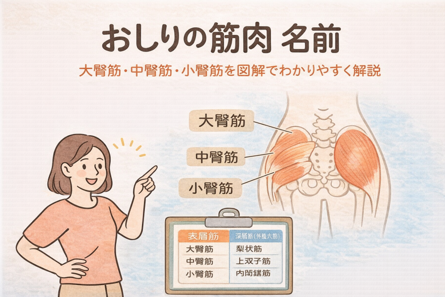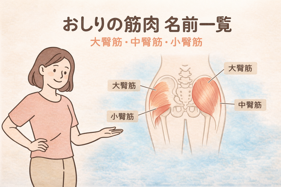おしりの筋肉 名前について、大臀筋・中臀筋・小臀筋など主要な筋肉の名称・位置・役割まで図解つきで詳しく解説します。ヒップアップや日常動作に関わる筋肉を正しく理解したい方に最適な入門ガイドです。