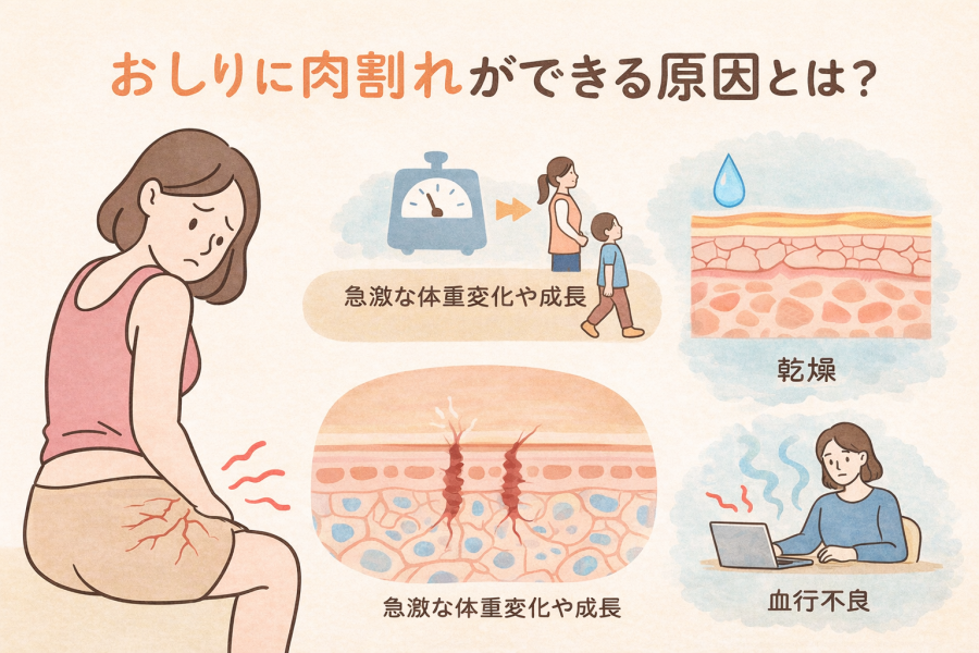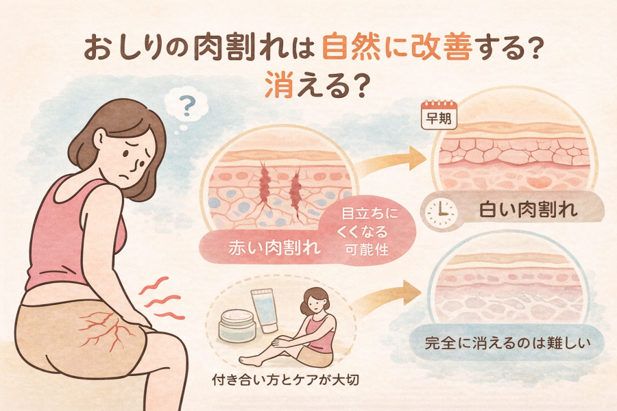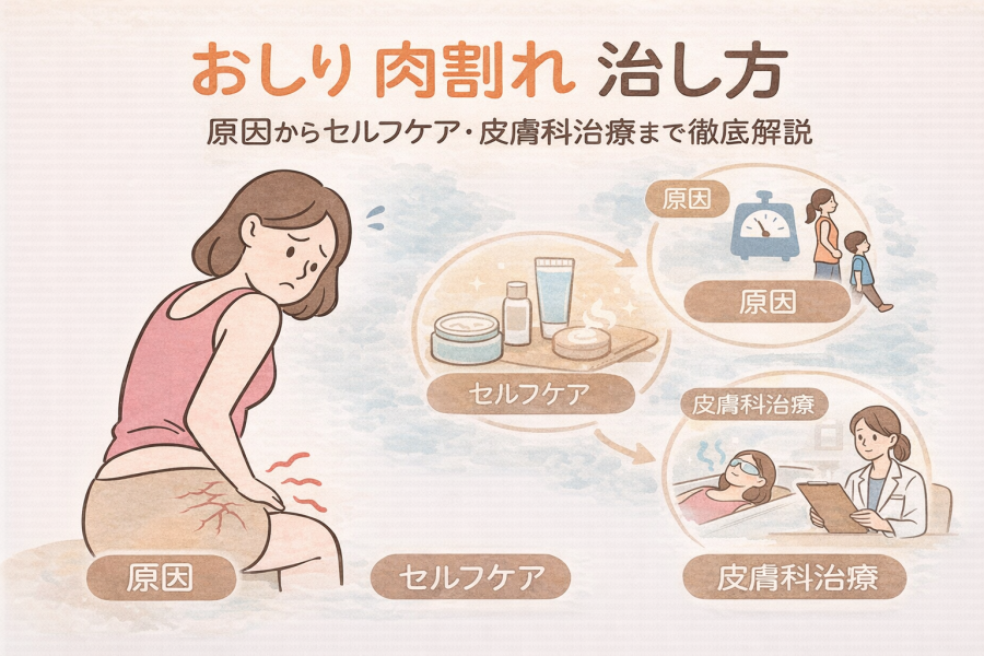 おしり 肉割れ 治し方を知りたい方へ。急な体重変化や成長で起こる肉割れの原因、セルフケアでできる改善方法、皮膚科での治療選択肢、消えない場合の考え方までわかりやすく解説します。