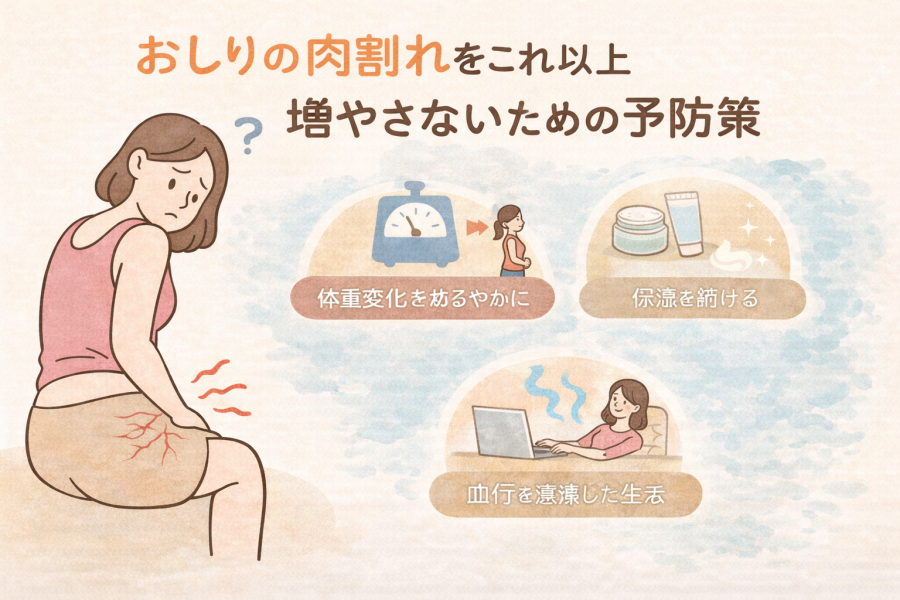これは、肉割れに悩む人が一番知りたいポイントかもしれません。おしりの肉割れは一度できると改善しづらいと言われているため、これ以上増やさない意識がとても大切だと考えられています。日常のちょっとした工夫が、予防につながる可能性があります。
