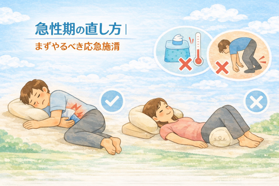 まず大前提として、急性期は無理に動かさないことが大切だと言われています。突然の強い痛みは、体が「これ以上動くと負担が大きいですよ」と知らせているサインとも考えられているようです。