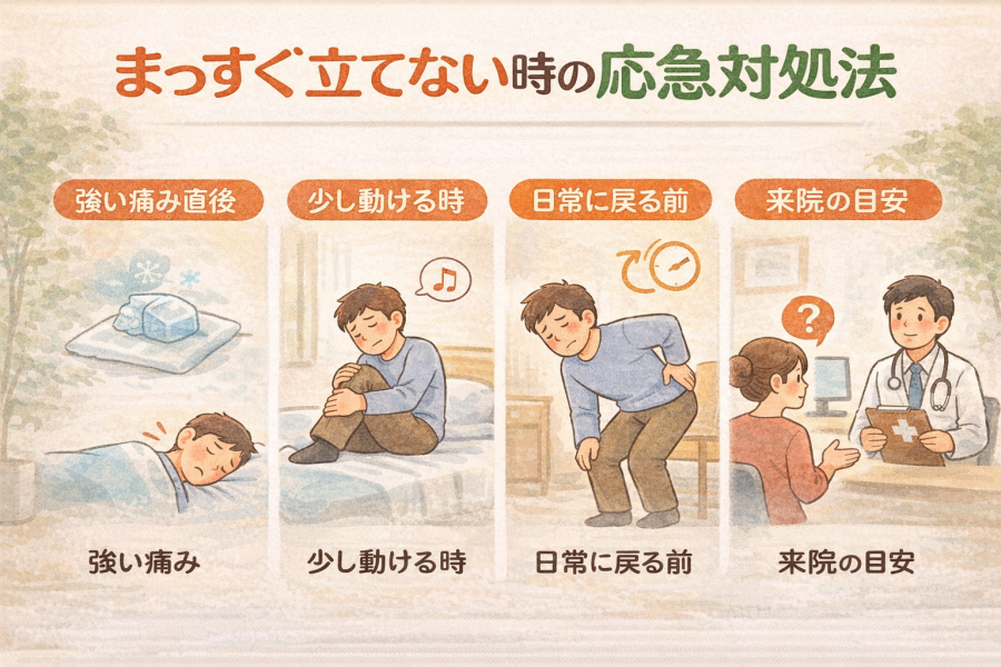 まっすぐ立てないときは、痛みの強さやタイミングによって対処の考え方が変わると言われています。無理に同じ対応をすると、かえって違和感が長引く場合もあるようです。ここでは段階別に整理します。