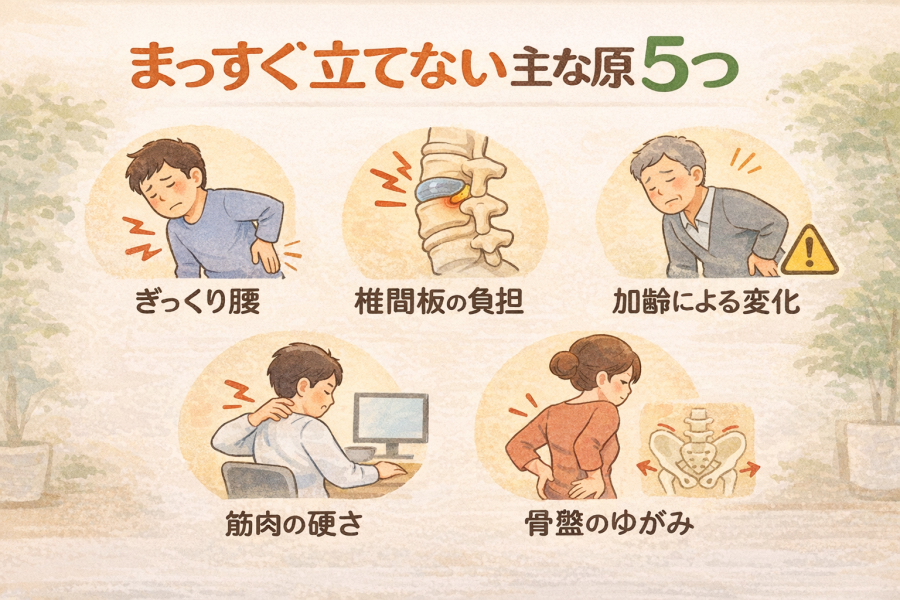 まっすぐ立てない状態には、いくつか代表的な原因があると言われています。ここでは症状ごとに、よく見られる5つを整理していきます。
