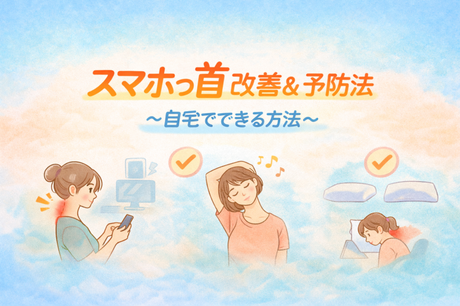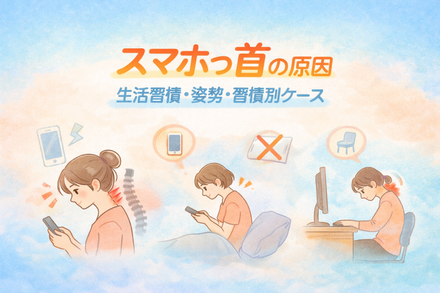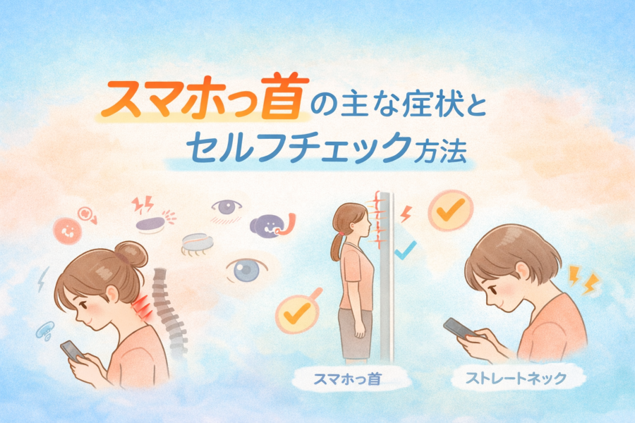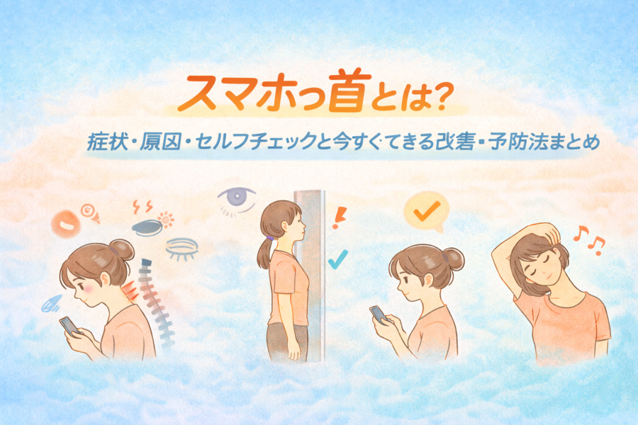 スマホっ首は長時間のスマホ・PC使用で起こる「ストレートネック」状態。首こり・頭痛・肩こりなどの不調の原因にもなります。本記事では症状の見分け方(セルフチェック)、原因、今すぐできる改善&予防法までわかりやすく解説します。