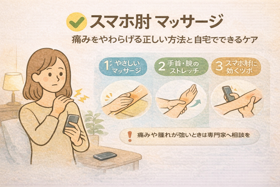 スマホ肘 マッサージ|スマホの使い過ぎで肘に違和感・痛みが出る「スマホ肘」を自宅で楽にするセルフマッサージとケア方法を専門家が丁寧に解説。前腕〜肘〜指までの具体的手順、やり方のコツ、注意点をわかりやすく紹介します。