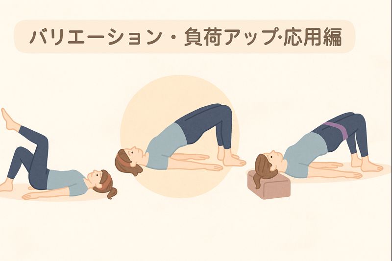そんなタイミングで気になるのが、負荷を少し上げる方法や応用パターンですよね。ブリッジは工夫次第で刺激を変えやすく、目的に合わせて調整しやすい運動だと言われています。ここでは、無理をしない範囲で取り入れやすいバリエーションを見ていきましょう。