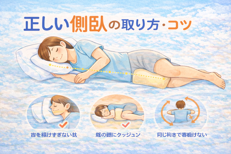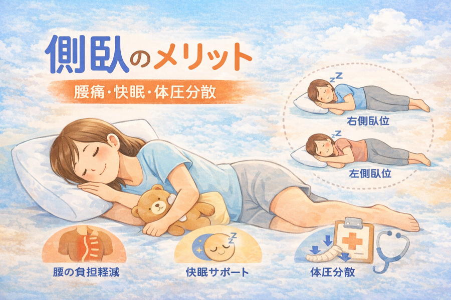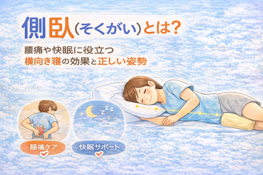 側臥(横向き寝)は、腰や背中への負担を分散しやすく、腰痛改善・快眠に効果的とされる寝姿勢です。本記事では側臥の意味・メリット・注意点・正しいやり方までわかりやすく解説します。