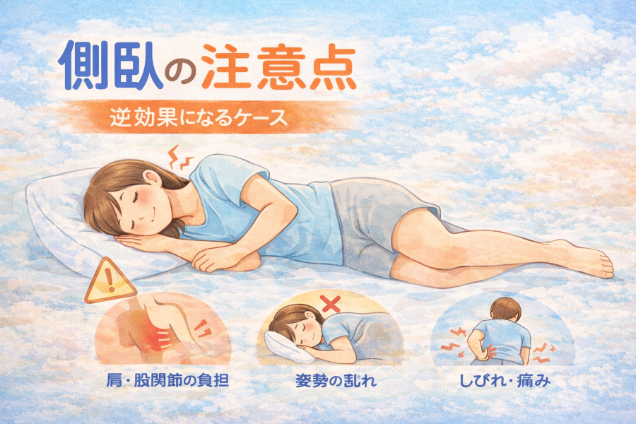 側臥は楽に感じやすい反面、同じ側ばかりだと肩や股関節に負担が偏ることもあると言われています。