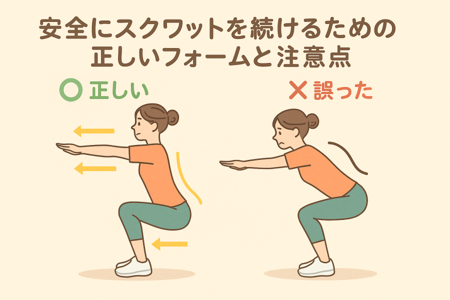 スクワットは負荷が自由に調整できる運動ですが、「痛みが出たら中断する」「鏡で姿勢をチェックする」といった工夫が安全性につながると言われています。