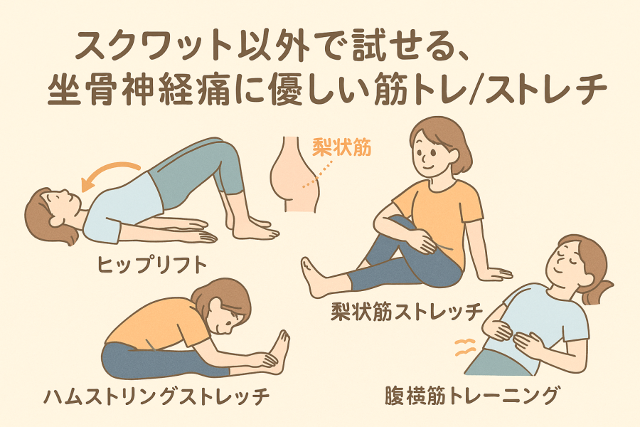 こんな相談を受けることがあります。無理にしゃがむ動作を続けるより、坐骨神経痛にやさしい筋トレやストレッチから取り入れる方法がよい場合もあると言われています。