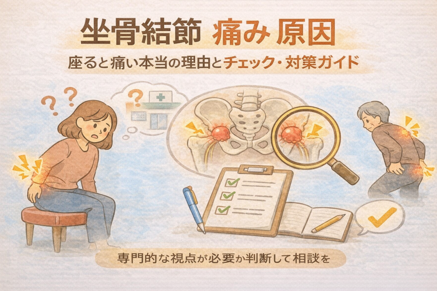 一度、簡単に確認してみましょう。イスに座ったとき、お尻の左右どちらか一点に痛みや違和感が出ませんか。さらに、立ち上がる瞬間にズキッとする感じがあれば、坐骨結節周辺に負担がかかっている可能性があると言われています。反対に、歩いているときは楽になる場合も多いようです。