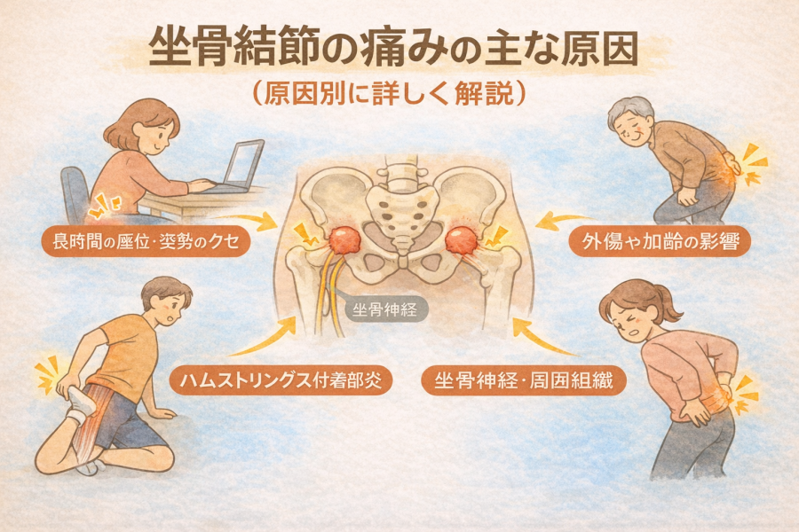 坐骨結節 痛み 原因を徹底解説。 長時間の座位・姿勢不良・ハムストリングス付着部炎などの主な原因から、症状の見分け方、日常でできるセルフケア、専門治療のポイントまでわかりやすく説明します。