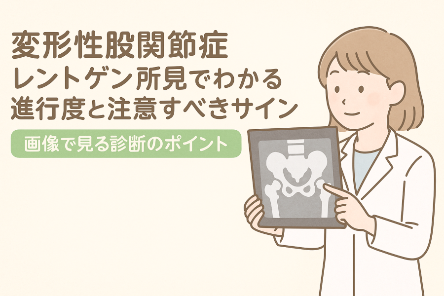 変形性股関節症 レントゲン所見から、関節裂隙の狭小化・骨棘・骨嚢胞・骨硬化など、進行度を判断するための典型的なサインとその意味、初期から末期までの変化をわかりやすく解説します。
