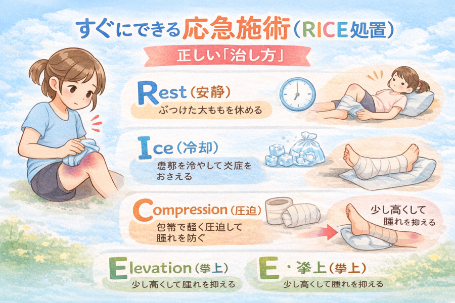 「太ももをぶつけた直後、まず何をすればいいの?」