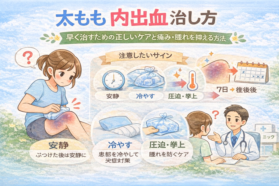 太もも 内出血 治し方|太ももの打撲・青あざの原因と症状をわかりやすく解説し、応急処置(RICE)や時期に応じたセルフケア、痛み・腫れを抑える対策、市販薬・治療院の活用法まで丁寧に紹介します。