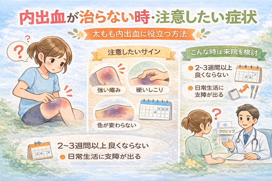 たとえば、太もも内出血の範囲が徐々に広がっている、触ると強い痛みが続く、硬いしこりのような感触が残る場合などです。