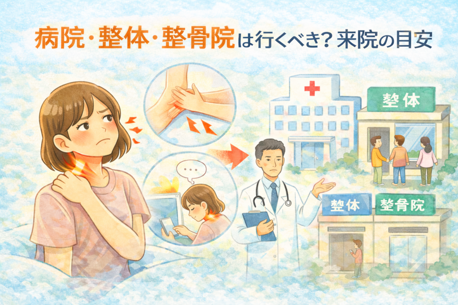 一般的には、強い痛みやしびれがある場合は病院での確認、筋肉や姿勢のバランスが気になる場合は整体や整骨院での相談、という考え方が紹介されることがあります。