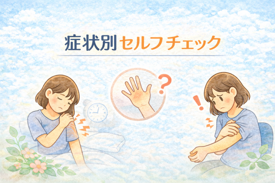 「腕全体がジンジンする」「指先だけピリピリする」など、範囲もヒントになります。