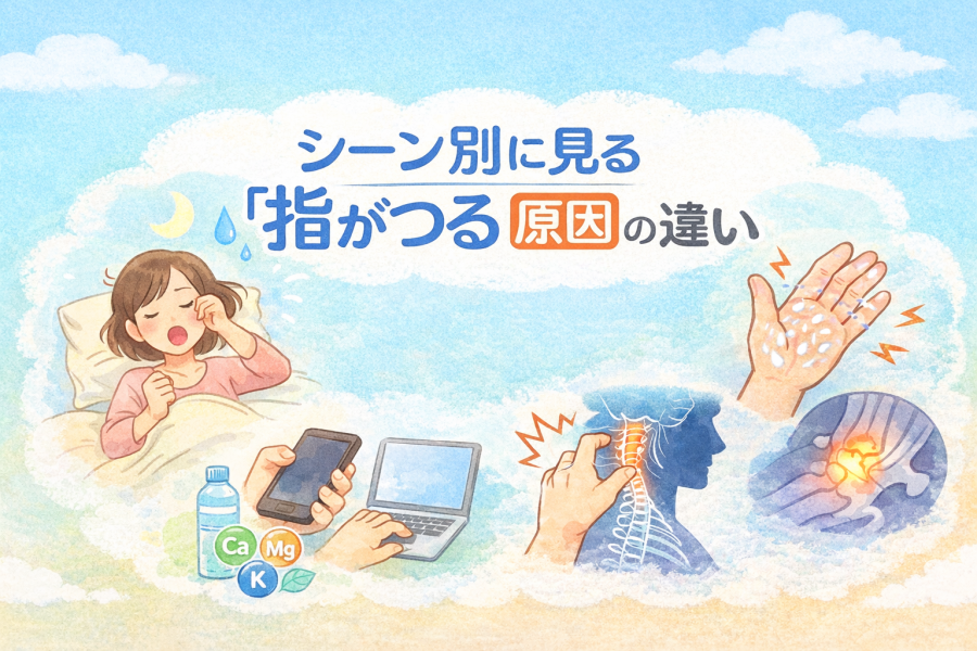 指つる 原因|指が突然「ギュッ」とつる理由を、筋肉・水分・ミネラル・神経・病気の可能性に分けて詳しく解説します。寝起き・日中・作業中など状況別の特徴や、対処法・受診の目安もわかりやすく紹介。