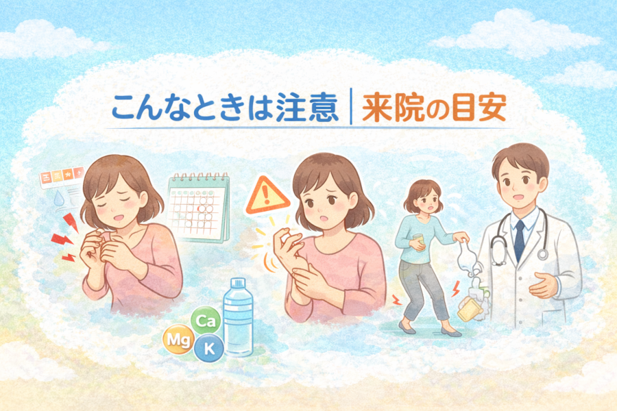 一時的で、すぐに落ち着く場合は筋肉疲労や水分不足が背景にあることが多いと言われています。しかし、短期間に何度も繰り返す場合や、痛みが強く長引くケースでは注意が必要と紹介されています(引用元:https://miyagawa-seikotsu.com/blog/)。