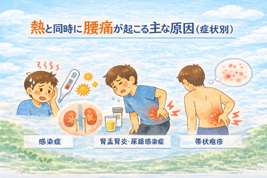 こんな不安を感じている方は少なくありません。実は、熱と腰痛が同時に出るときは、原因によって現れ方が少しずつ違うと言われています。ここでは症状別に、考えられる主な原因を整理していきます。