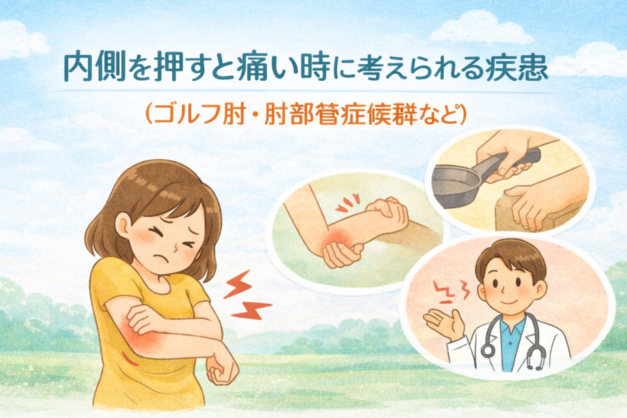 そんな違和感から不安になる方は少なくありません。肘の内側を押して痛みが出る場合、筋肉や腱、神経に負担がかかっている状態が関係していると言われています。