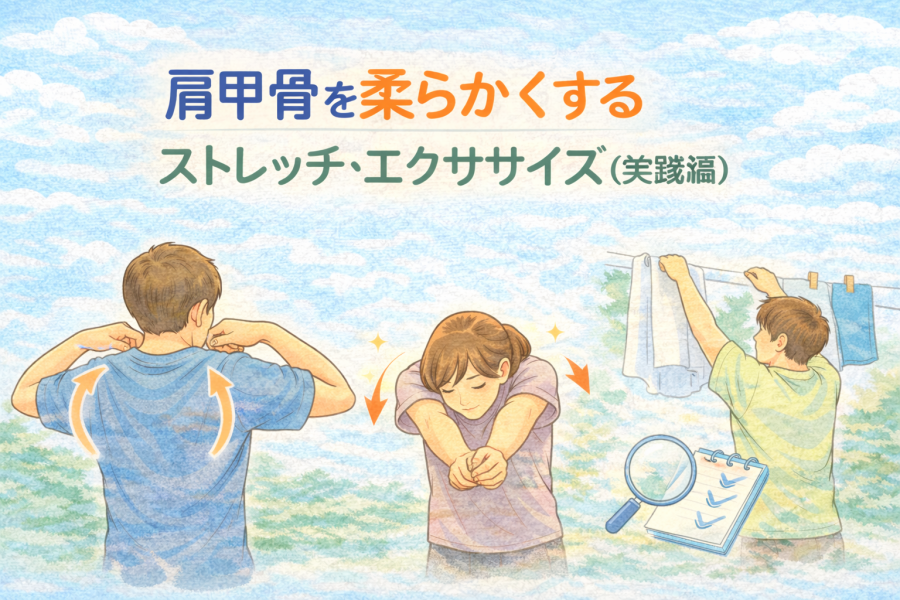 「じゃあ、動かさないほうがいいの?」と思うかもしれませんが、そうではないと言われています。大切なのは、動かしたあとに“支えられる状態”を作ることです。肩甲骨周りの筋肉を意識した軽いエクササイズを取り入れることで、動きと安定の両立がしやすくなると考えられています。