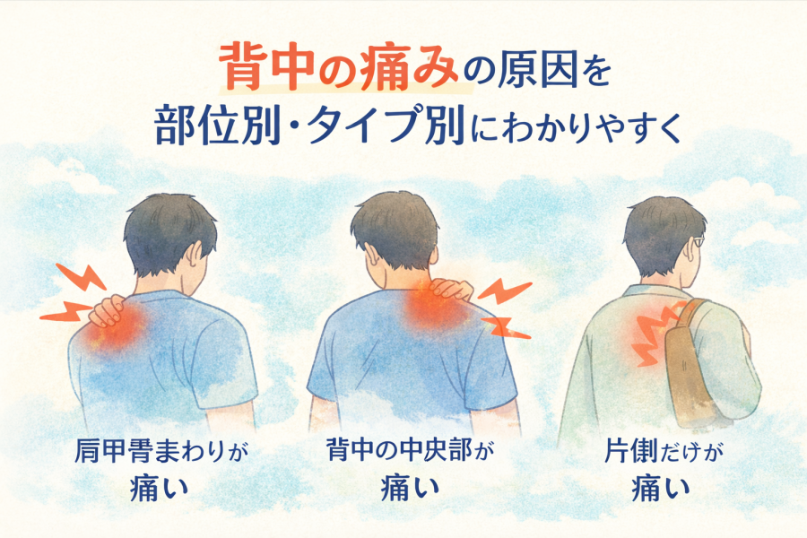 このように、背中の痛みは部位やタイプによって背景が異なると考えられています。「どこが、どんなふうに痛いのか?」を整理するだけでも、原因のヒントが見えてくるかもしれません。
