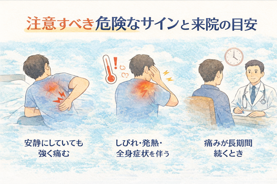 #背中の危険サイン#安静時の痛み#しびれと発熱#長引く痛み#来院の目安