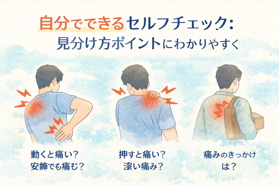 そう感じたときは、まず自分でできるセルフチェックから始めてみましょう。背中の痛みは原因によって特徴が異なると言われています。ポイントを押さえて整理するだけでも、状態の目安がわかりやすくなります。