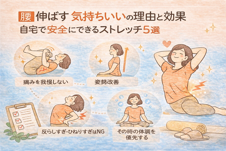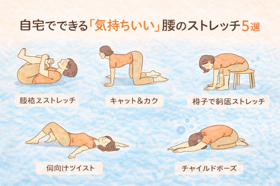そんな声、よく聞きます。ここでは腰 伸ばす 気持ちいい感覚を得やすい、自宅でできるストレッチを5つ、会話形式で紹介します。どれも無理なく行える方法だと言われています。