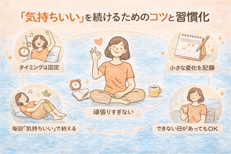 「痛いけど我慢」は避け、「楽」「心地いい」と感じる範囲で続けることで、腰を伸ばす良さを感じやすいと考えられています。