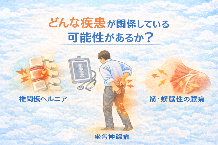 特に、前かがみ姿勢で痛みが強くなる場合は、関連が考えられることもあると言われています。