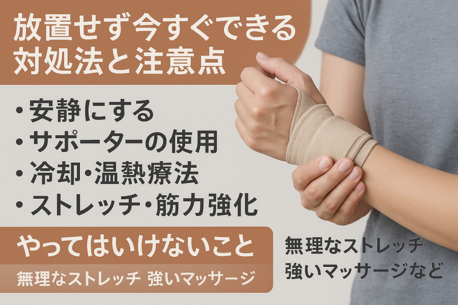 多くの場合、まずは「保存療法」と呼ばれる方法で改善を目指すと言われています。保存療法には、炎症を抑える外用薬や注射、電気や温熱を用いた物理療法、テーピングによる固定などが含まれます。特に、炎症が軽度のうちに対応することで、痛みの緩和や動きの改善が見込まれるとされています【引用元:https://www.mayoclinic.org/diseases-conditions/de-quervain-tenosynovitis/diagnosis-treatment/drc-20371333】。