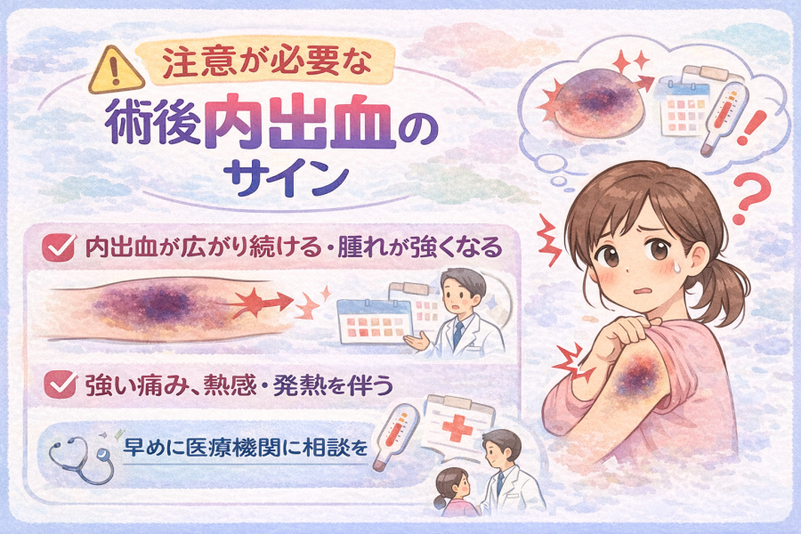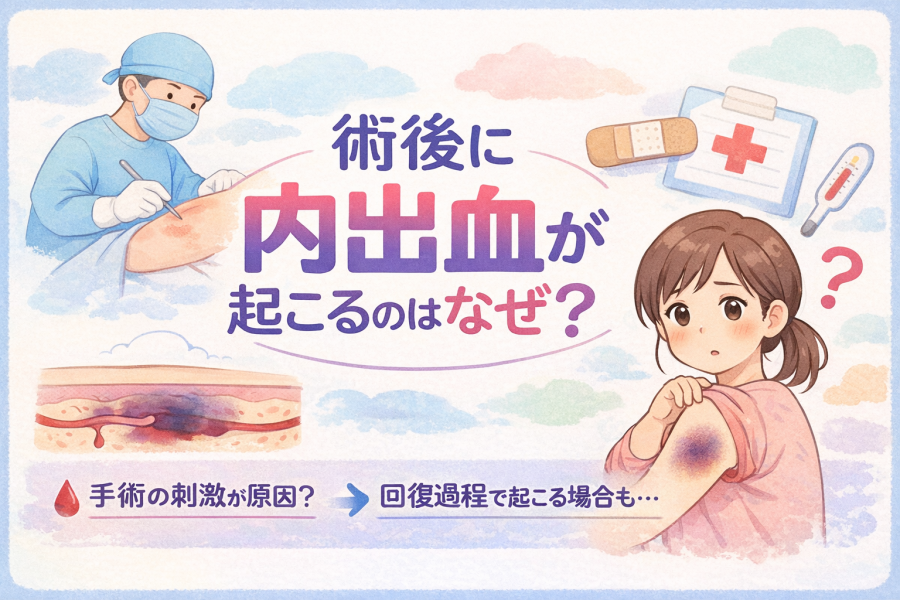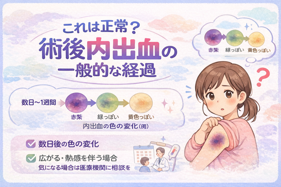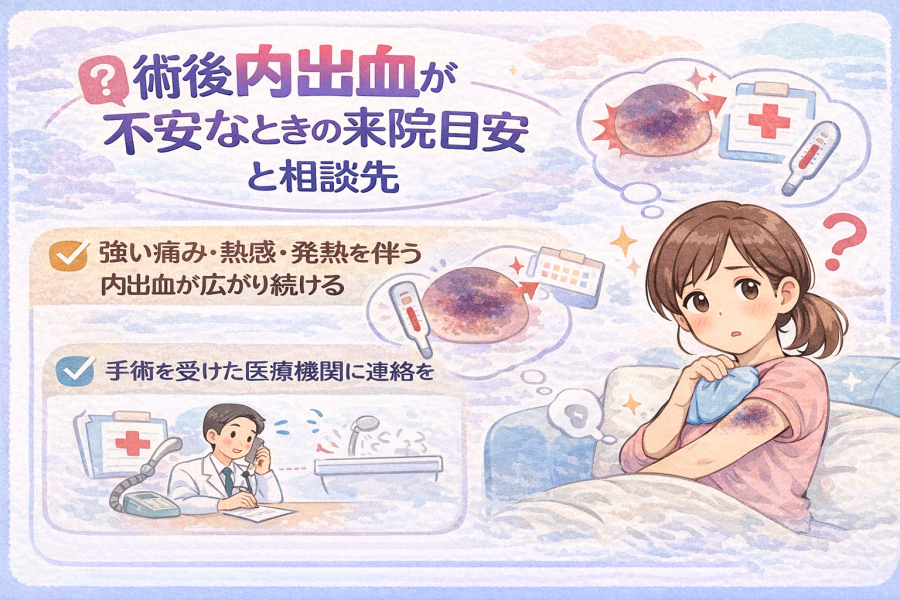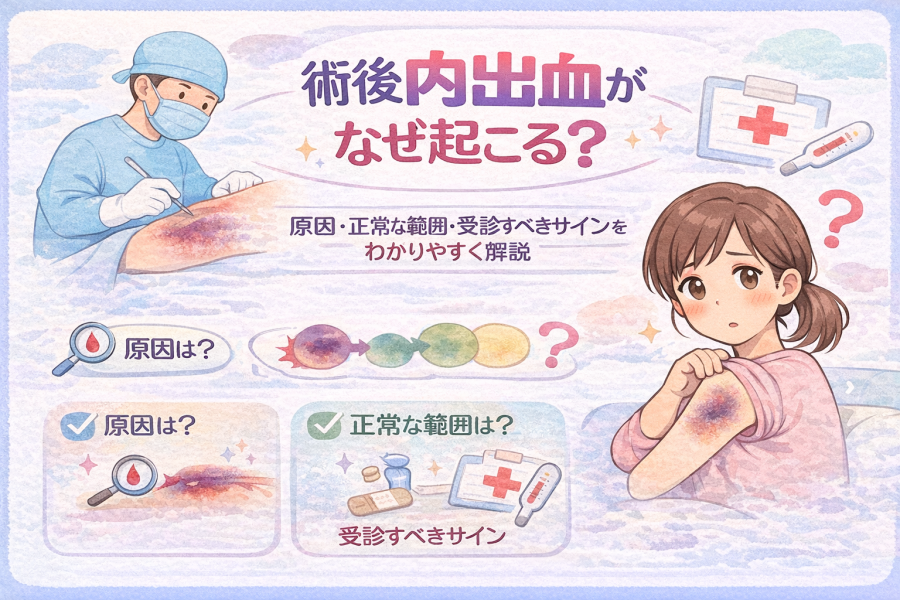 術後 内出血 なぜ起こるのか不安な方へ。 手術後に内出血が出る理由、自然な経過と注意が必要な症状、受診の目安までを医療情報をもとにわかりやすく解説します。