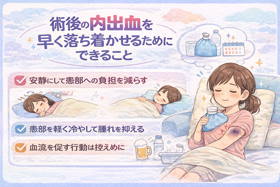 術後すぐに無理な動きをすると、血管への刺激が続き、内出血が広がりやすくなることがあるそうです。できるだけ安静を心がけ、患部に負担がかかる動作は控える意識が重要と考えられています。
