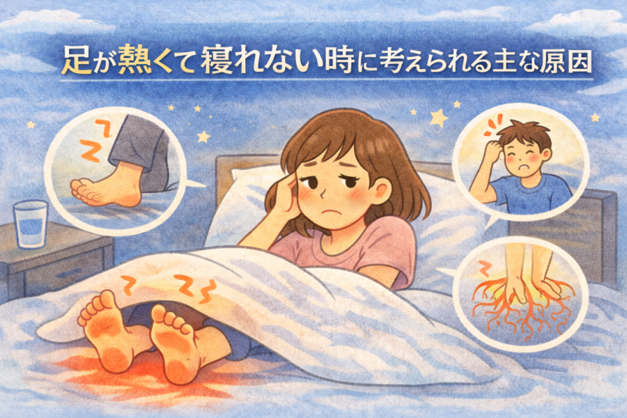足が熱くて寝れない状態は、血行の変化や自律神経の影響など、日常的な要因で起こるケースも多いと言われています。ただし、症状が長く続いたり、しびれや痛みを伴う場合は、別の要因が関係している可能性も考えられているそうです。