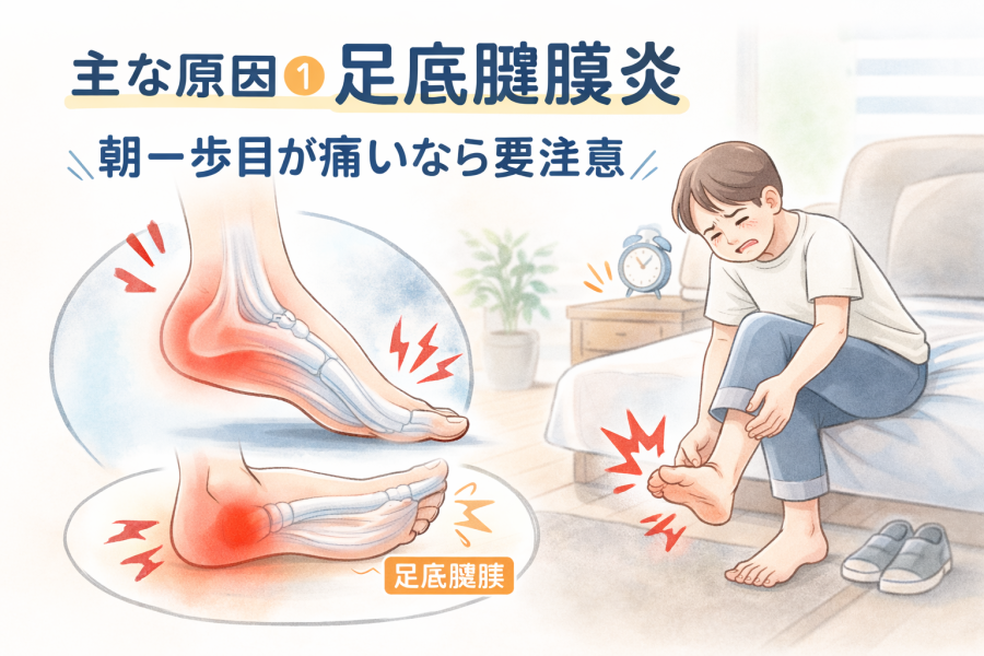 その代表的な原因のひとつが足底腱膜炎と言われています。足の裏には、かかとから指の付け根にかけて“足底腱膜”という組織が広がっており、歩行時の衝撃を和らげるクッションのような役割をしているそうです。この部分に繰り返し負担がかかると、炎症が起こり、刺すような痛みにつながることがあると解説されています。