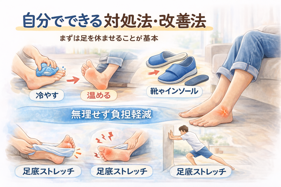 まず大切なのは、痛みが強いときに無理をしないことだと言われています。長時間の立ち仕事やランニングを続けると、炎症が悪化する可能性があると解説されています。痛みが出ている間は、できる範囲で負担を減らすことがポイントとされています。