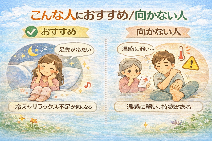 そう感じる方も多いですよね。実は、足の裏を温める習慣は相性があります。ここでは、どんな人に向いているのか、逆に注意が必要なケースについて整理します。