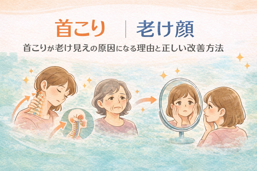 姿勢の崩れが首こりにつながっている場合、全身のバランスを整える施術によって負担が軽減される可能性があるようです。首こりと老け顔の両面からアプローチする考え方として紹介されています。