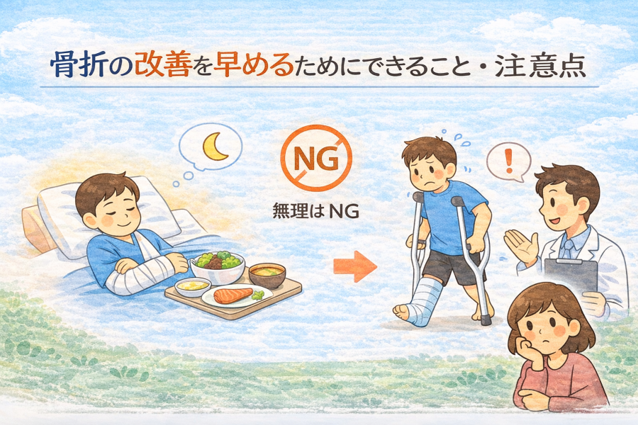 そう不安になる方もいますが、骨折直後〜回復途中は、体を休めることが回復につながると考えられています。睡眠をしっかり取る、無理な動作を避けるなど、シンプルな行動が重要だと言われています。