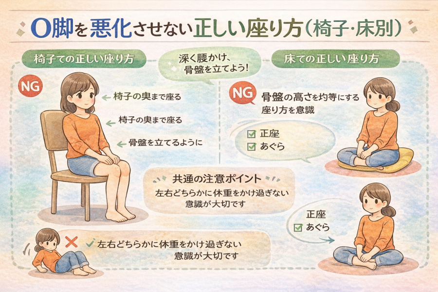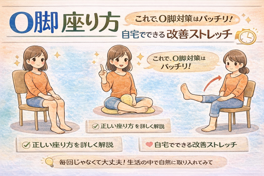 o脚 座り方を徹底解説。日常生活でやりがちなNGな座り方と、骨盤を整える正しい座り方・簡単ストレッチでO脚の悪化を防ぎ、脚のライン改善を目指す実践ガイド。