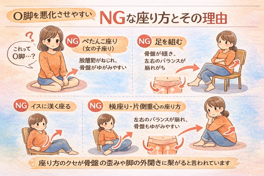 そう思う人、多いかもしれません。でも実際は、日常の座り方がO脚に影響することがあると言われています。特に長時間座る生活が続くと、ちょっとしたクセが積み重なりやすいようです。